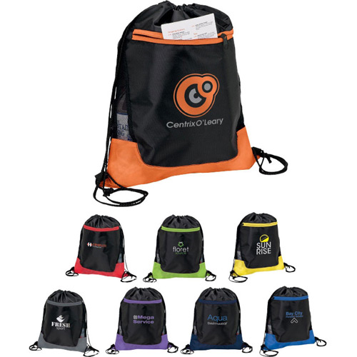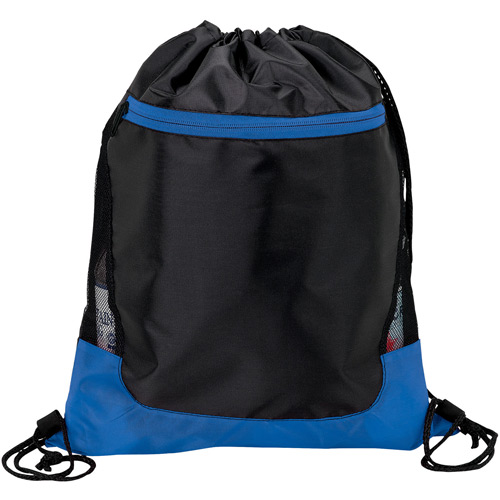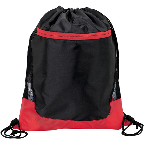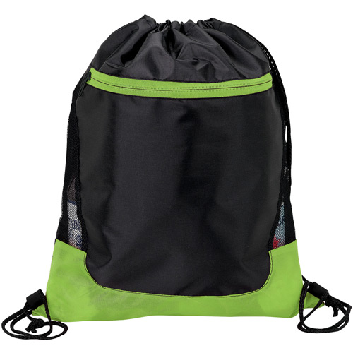 Sport bag has drawstring closure, zippered front pocket and mesh side trims. Drawstrings double as backpack straps. Lightweight 210D material.