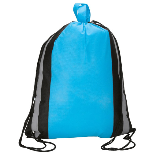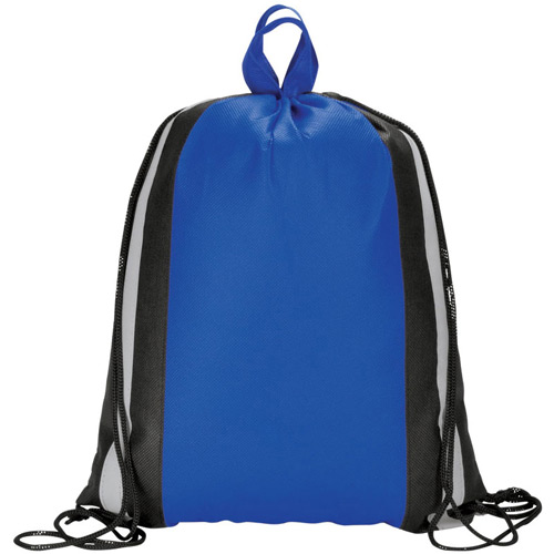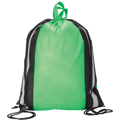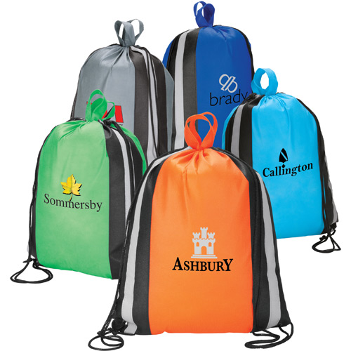 This drawstring shopper/backpack sports convenient carry handles and drawstring straps. These imprinted drawstring backpacks are available in a variety of bright colors and have cool, stylish reflective safety stripes. Your large imprint will really stand out on these bold bags.